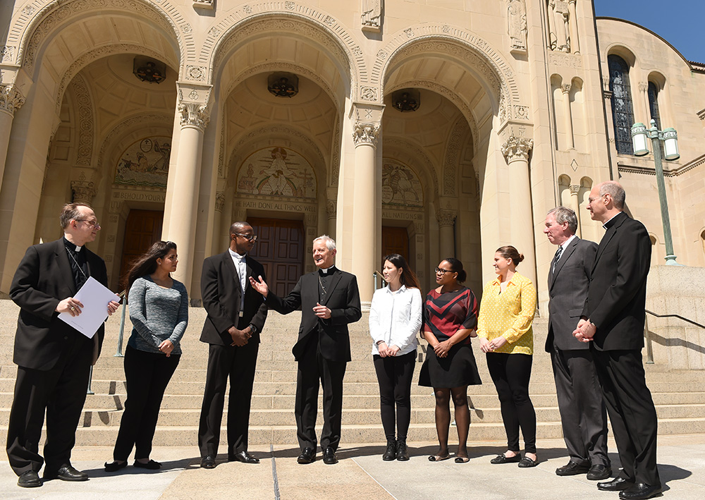 Cardinal Donald Wuerl, archbishop of Washington and University chancellor, center, talks with students from Catholic University’s School of Architecture and Planning about the competition to design the altar and other furnishings for the papal Mass. Also pictured are Auxiliary Bishop Barry Knestout of Washington, left; John Garvey, persident of Catholic University, second from right; and Monsignor Walter Rossi, rector of the Basilica, right.
