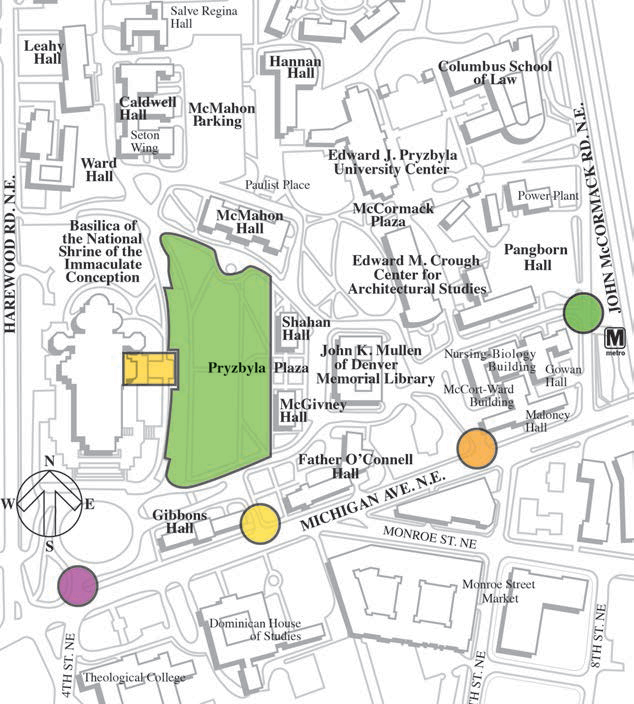 • All those traveling via automobile (including limousines and taxicabs) should be prepared to find alternate routes to reach the Basilica/CUA venue. Streets in the immediate vicinity of the venue — Michigan Avenue, Monroe Street, 4th Street, John McCormack Road, and Harewood Road — may be closed early in the day. (See map of area road closures.)