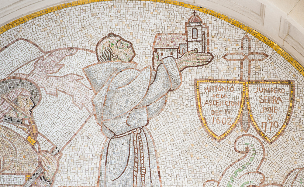 Junípero Serra is depicted in a mosaic above the north arch of the East Portico of the Basilica of the National Shrine of the Immaculate Conception just a few feet from where Pope Francis will be seated at the canonization Mass for Serra.