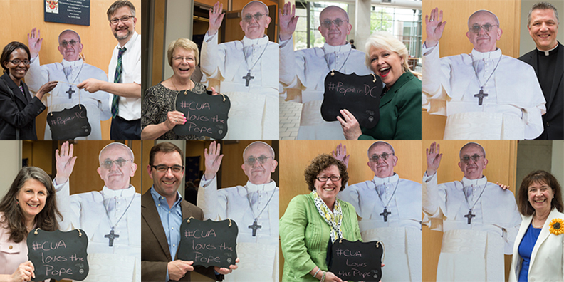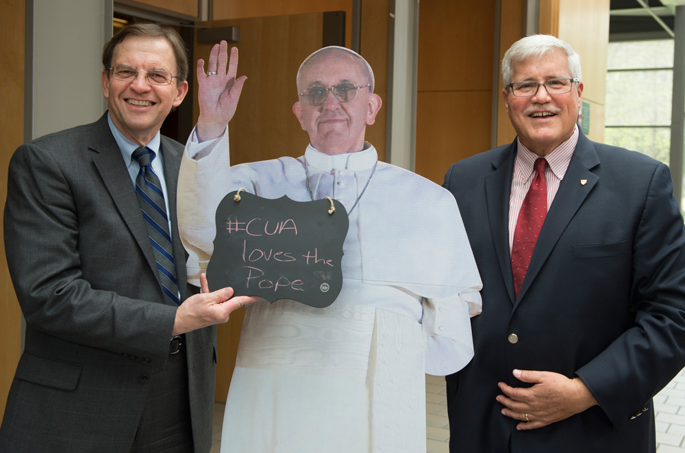 Frank Persico, vice president for University relations and chief of staff, and Victor Nakas, associate vice president for public affairs, posed with the cutout. Nakas held a small piece of black slate with the words, “#CUA loves the Pope.”