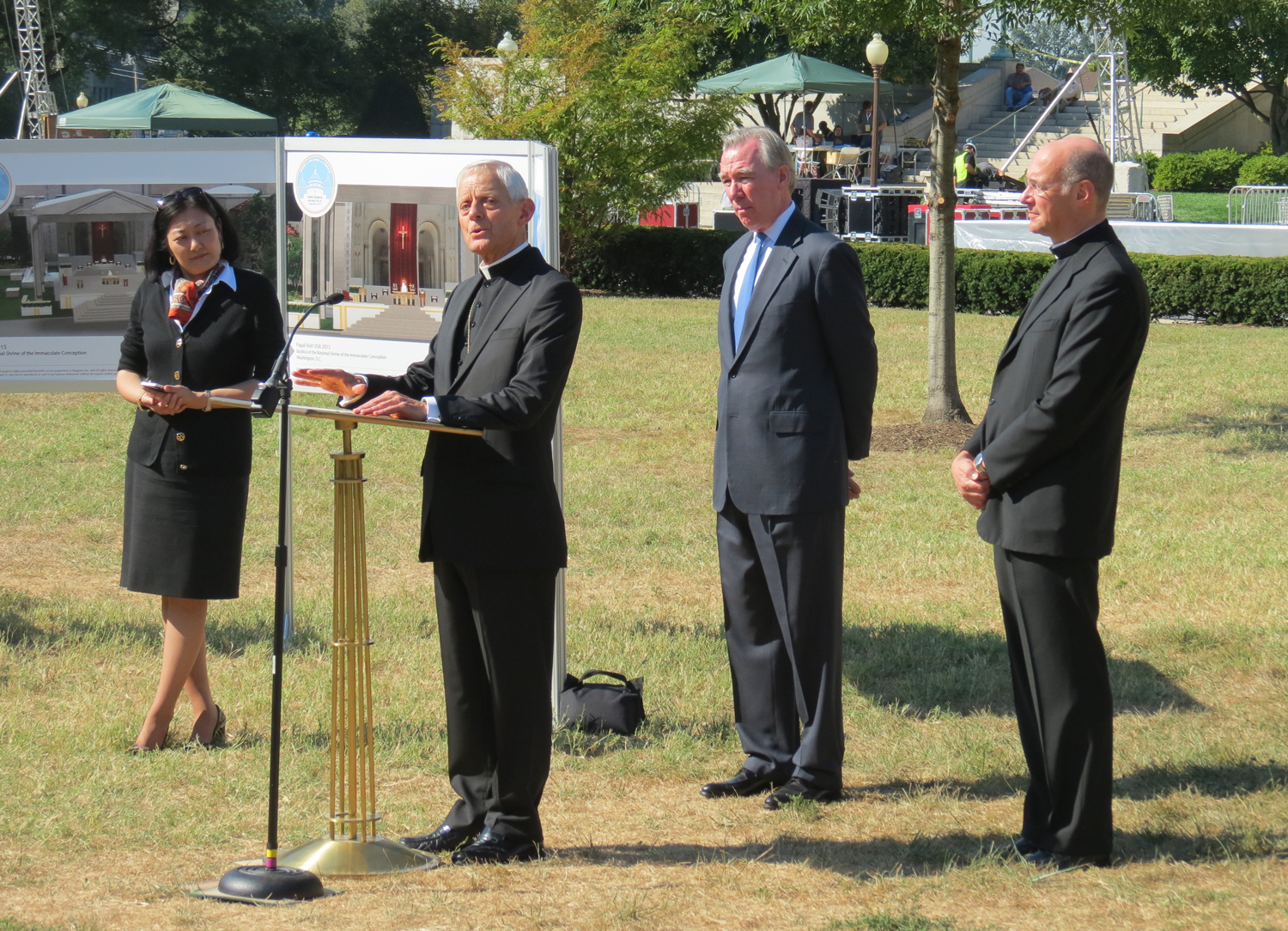 With Cardinal Wuerl at the news conference were, from left, Chieko Noguchi, director of media and public relations for the Archdiocese of Washington; John Garvey, president of The Catholic University of America; and Monsignor Walter Rossi, rector of the Basilica of the National Shrine of the Immaculate Conception.