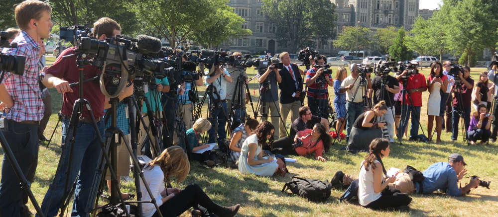 The reporters stood in the very spot where 25,000 people will gather in six days for the Mass. Before the press conference began, reporters got to witness staff members from the Office of Facilities Maintenance and Operations remove a light pole that stood in the way of the view of the East Portico of the Shrine.