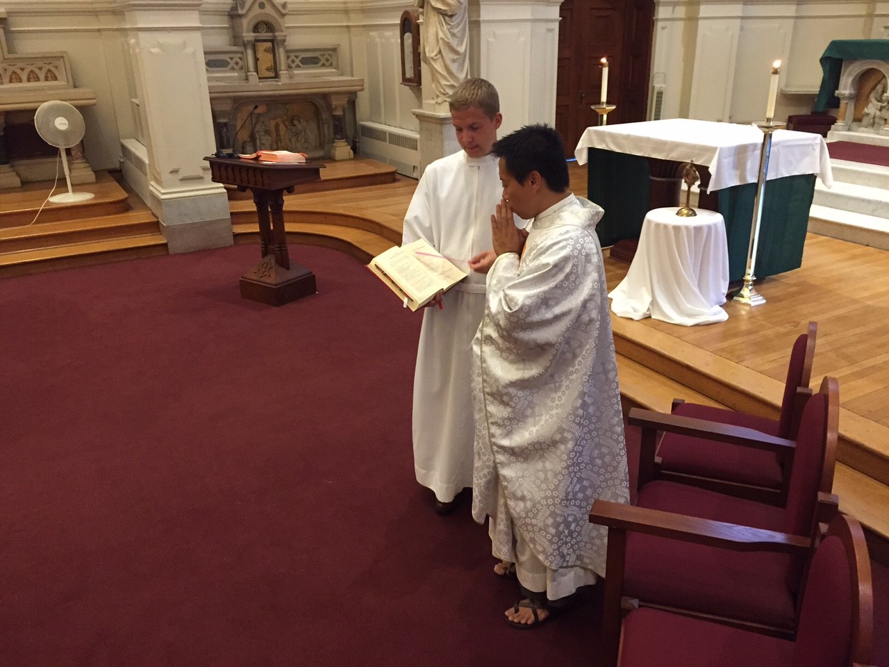 In preparation for next week’s papal visit, students at The Catholic University of America practiced their Spanish-language skills during a special Mass held Tuesday at Caldwell Chapel. The Mass, which was mostly in Spanish, was intended to help students learn the Mass responses so they can be better prepared when Pope Francis celebrates the Canonization Mass of Blessed Junípero Serra in Spanish Sept. 23.