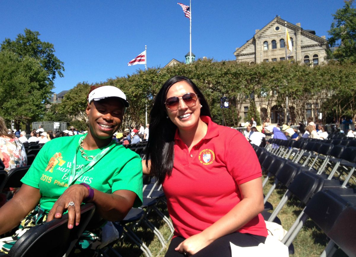 In their seats at noon, CUA alumni Elizabeth Briones, B.A. 2014, and Jacqueline Corbin-Armstrong, B.A 1985, M.S.M. 2015, marveled at the view of the altar and made fast friends. “Catholic University is my home. It was very important for me to come back and be here for the visit of the Holy Father,” Briones said.