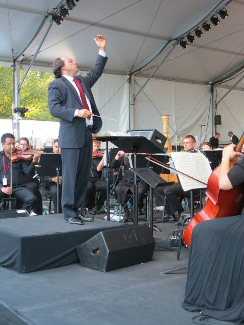 Simeone Tartaglione, conductor of the CUA Symphony Orchestra, conducts University musicians following the conclusion of the papal Mass on Sept. 23.